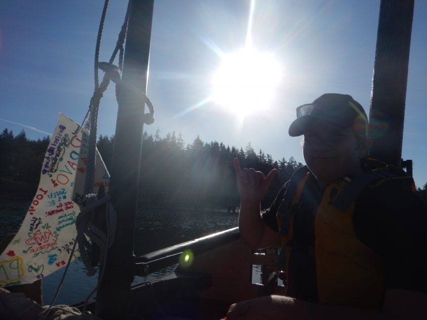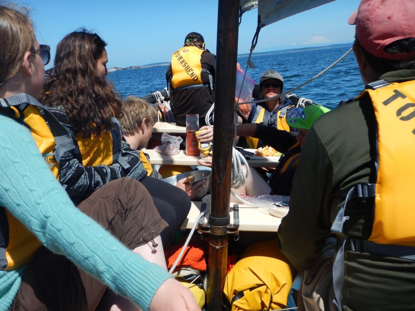 After spending 4 hours organizing and packing all of the gear we would need, we set out across the bay to Kilisut Harbor. Our goal was to overnight in Mystery Bay. The boat crew practiced keeping “red right returning” as we jibed our way downwind through the winding channel.