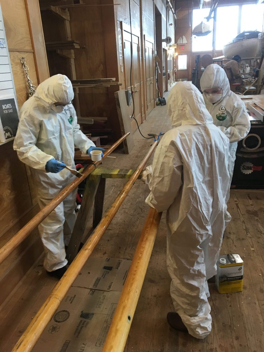 Then we headed down to the shop to do a bit more work on Onward and on our personal projects. The Onward crew focused on getting a coat of varnish on her boom, gunter, and mizzen mast and boom. The girls working on personal projects focused on drilling holes for their tool tray handles, mortising mallet heads, and shaping mallet handles.