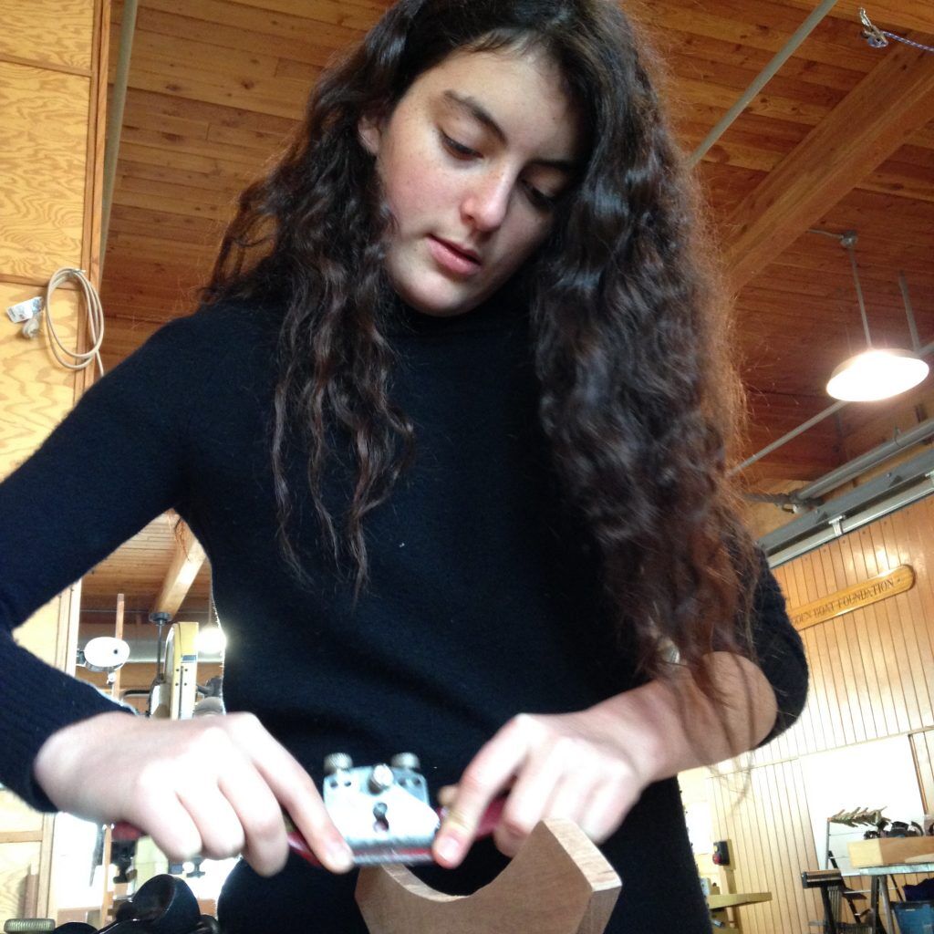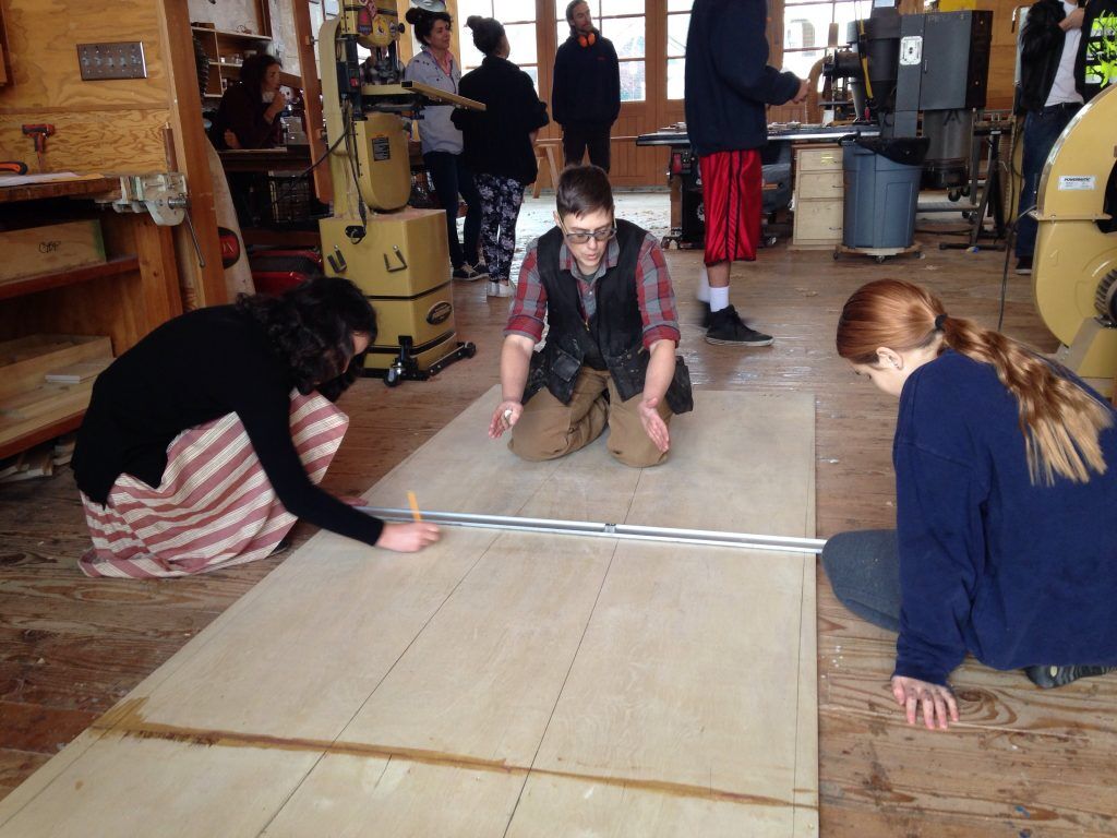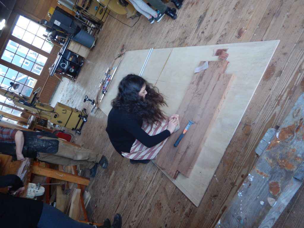 While the bench project crew was laying out and cutting their poplar boards for their tool trays, the crew in the boatshop worked on our Skunk Island Skiff. They planed and sanded gussets and sides for the mid-ship frame of the boat and ended the day gluing them up. The white bedding compound on the dark Sapele wood reminded us all of marshmallows and graham crackers. Big plans are afoot to have some creative snacks next week!