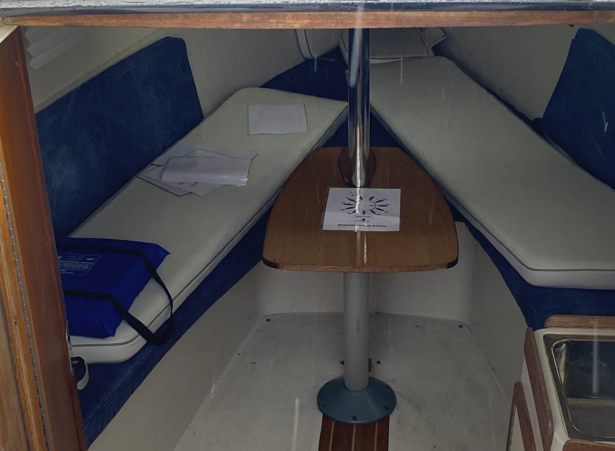 There is generous sitting headroom and the boat feels spacious with the centerboard box completely hidden under the cabin sole. Average sized people will find this comfortable with ample room.