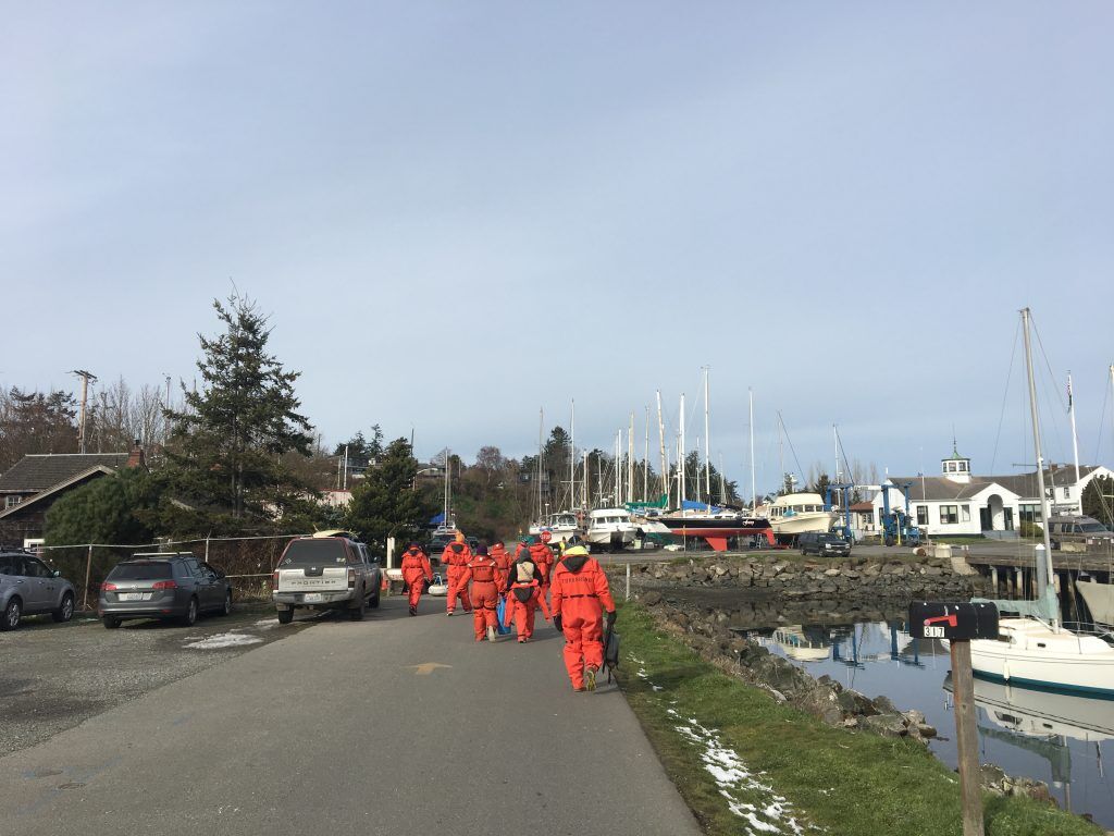We combined the launching of Townshend with hauling out our other longboat, Bear. Due to the cold winter weather, we all dressed in our orange exposure suits, grabbed gloves and hats and then headed to the dock. We towed Bear to the Boat Haven ramp using the motor launch Martha J, where Townshend was waiting for us on the trailer.