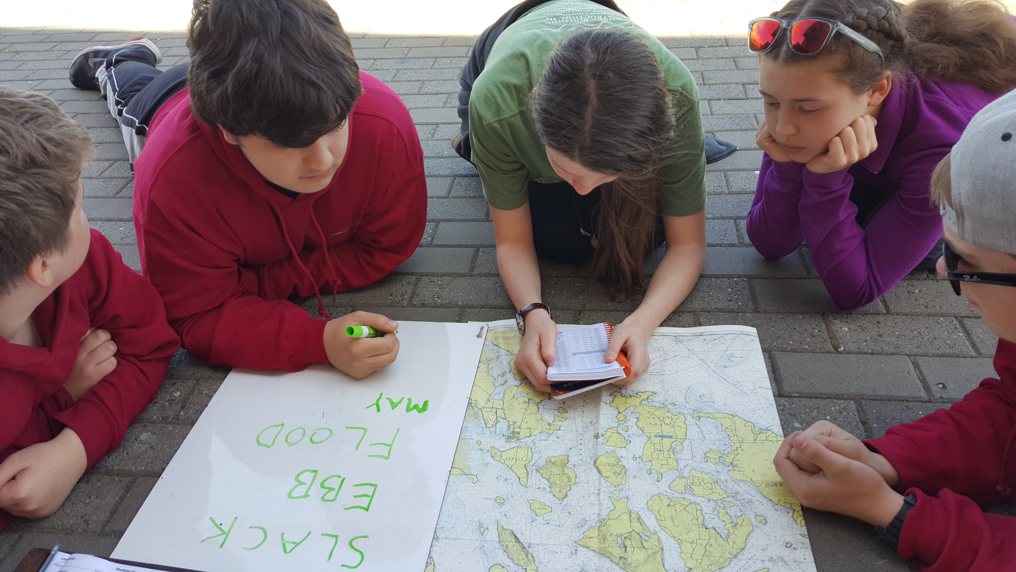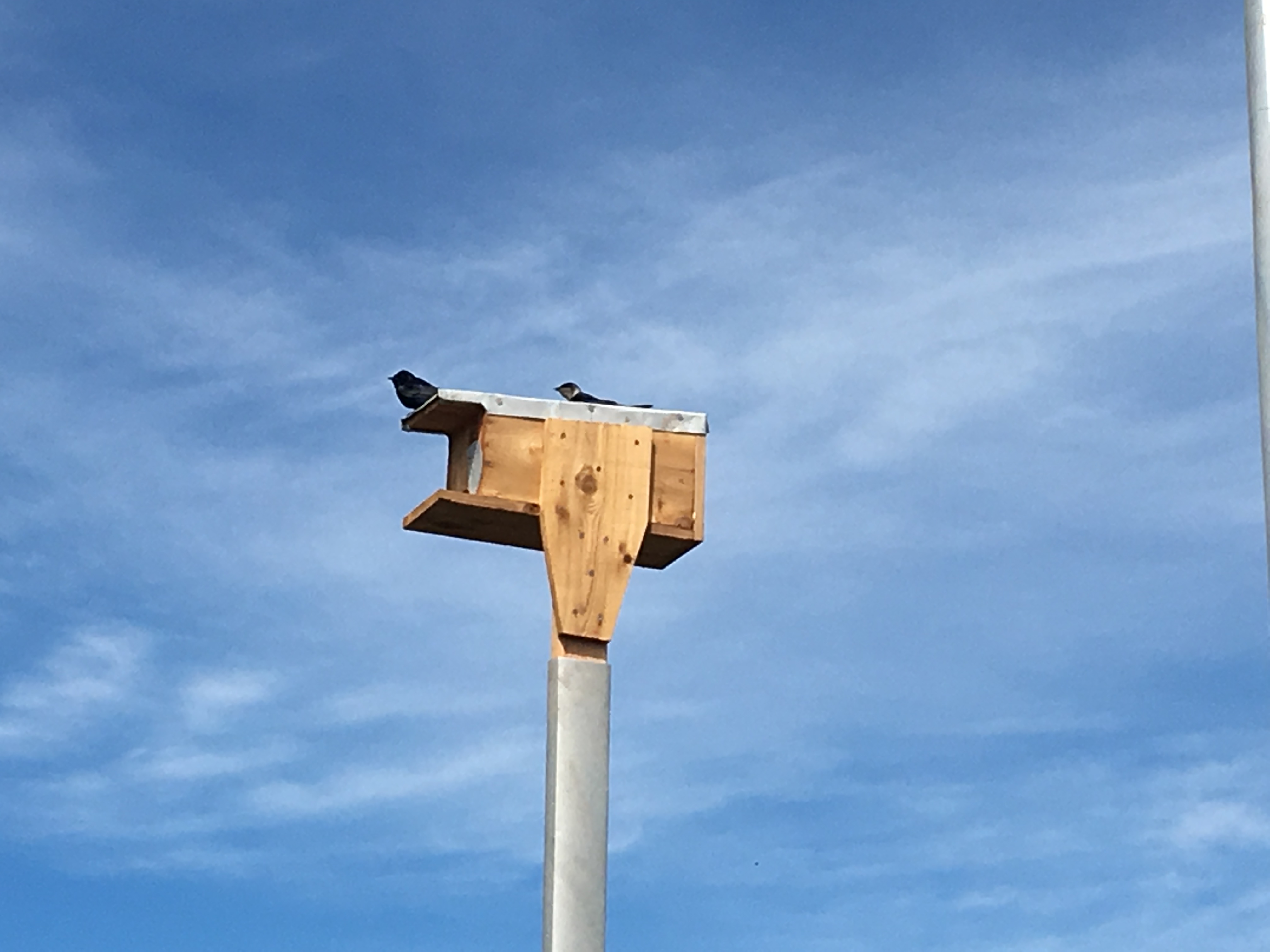 After the work was done we only had an hour left of class and decided instead of longboating, we’d take a walk over to the Purple Martin birdboxes located out at Pt. Hudson navigation marker 4. Much to our surprise there were Purple Martins on the boxes! There were two pair perched on two of the boxes and we approached slowly to witness their flight and their song. We were very excited to see how quickly our newly-built boxes were being used! We also relished in the sunshine during our Moment of Silence and our newly printed Bravo Team Sweatshirts in Cardinal Red. 🙂