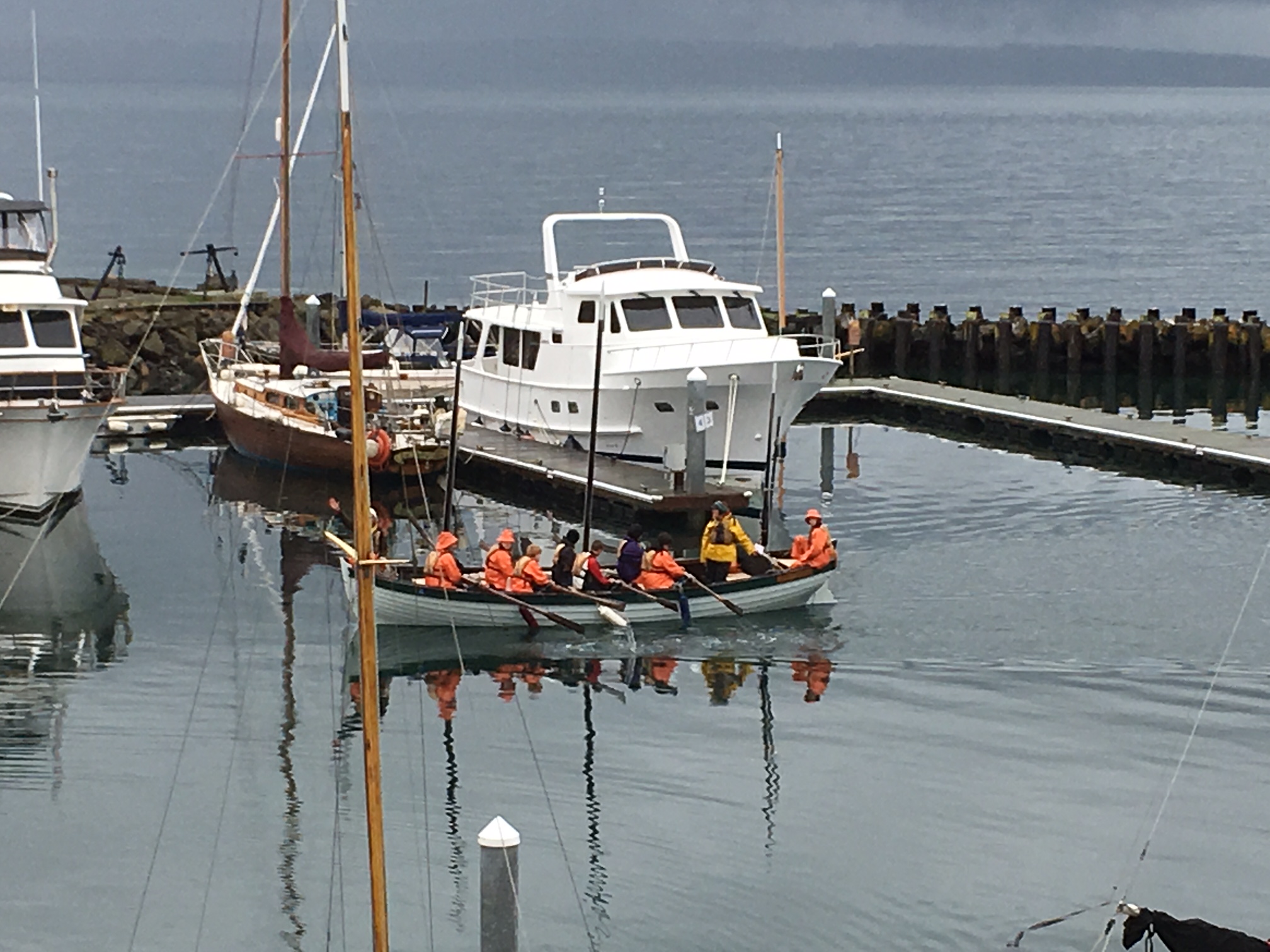 Luca took leadership as coxswain and got us into the bosun’s locker for gear packing and raingear donning. After boarding the boat and loading gear we left the dock with virtually no wind blowing. The sea-state was calm and we rowed out of Point Hudson marina with barely any other vessel traffic or ripples on the water.