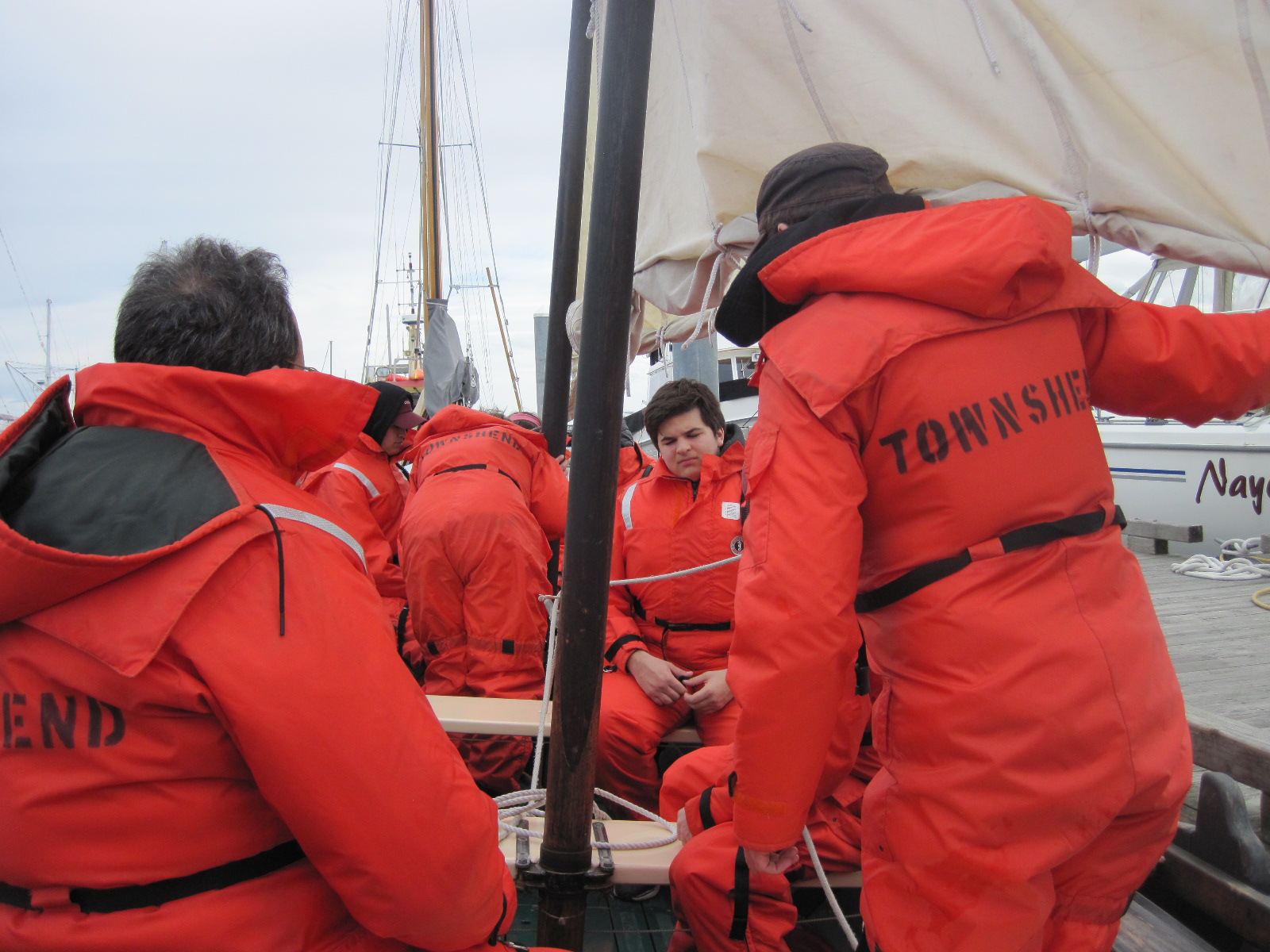 We numbered off our crew and practiced our count-off. Then we climbed aboard. As Captain Sonia announced the squall drill, we had to find our partners and help them into their exposure suits. Not any easy task on a 26 foot long boat!