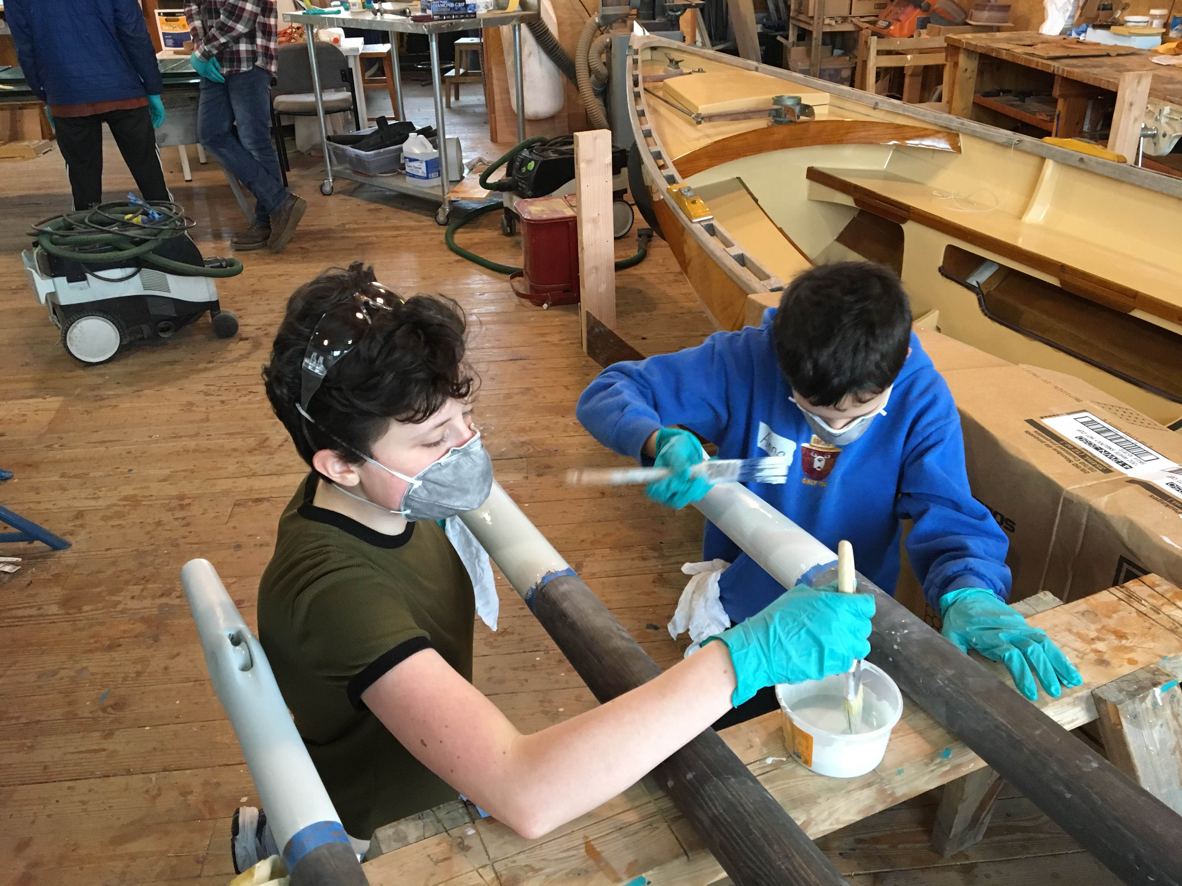 Then it was time to apply our finishes. The mast tips recieved a coat of Seattle Gray, the sole boards and sheerstrake were painted dark ย green, and varnish was carefully applied to the name boards and the transom. We learned how to roll and tip, to find the “just right” amount of paint for our brushes, to work the wet edge, to look for holidays, and do it all while not getting paint everywhere! It was awesome.