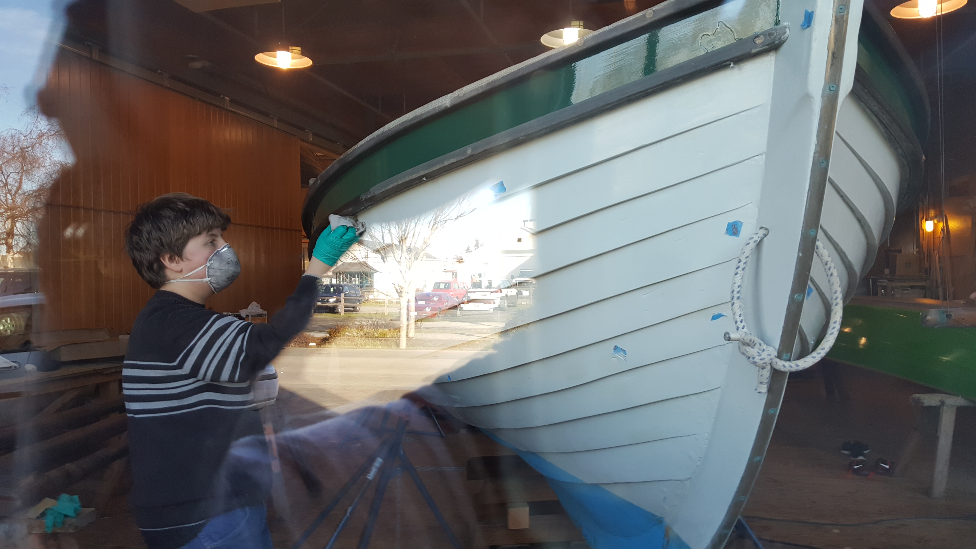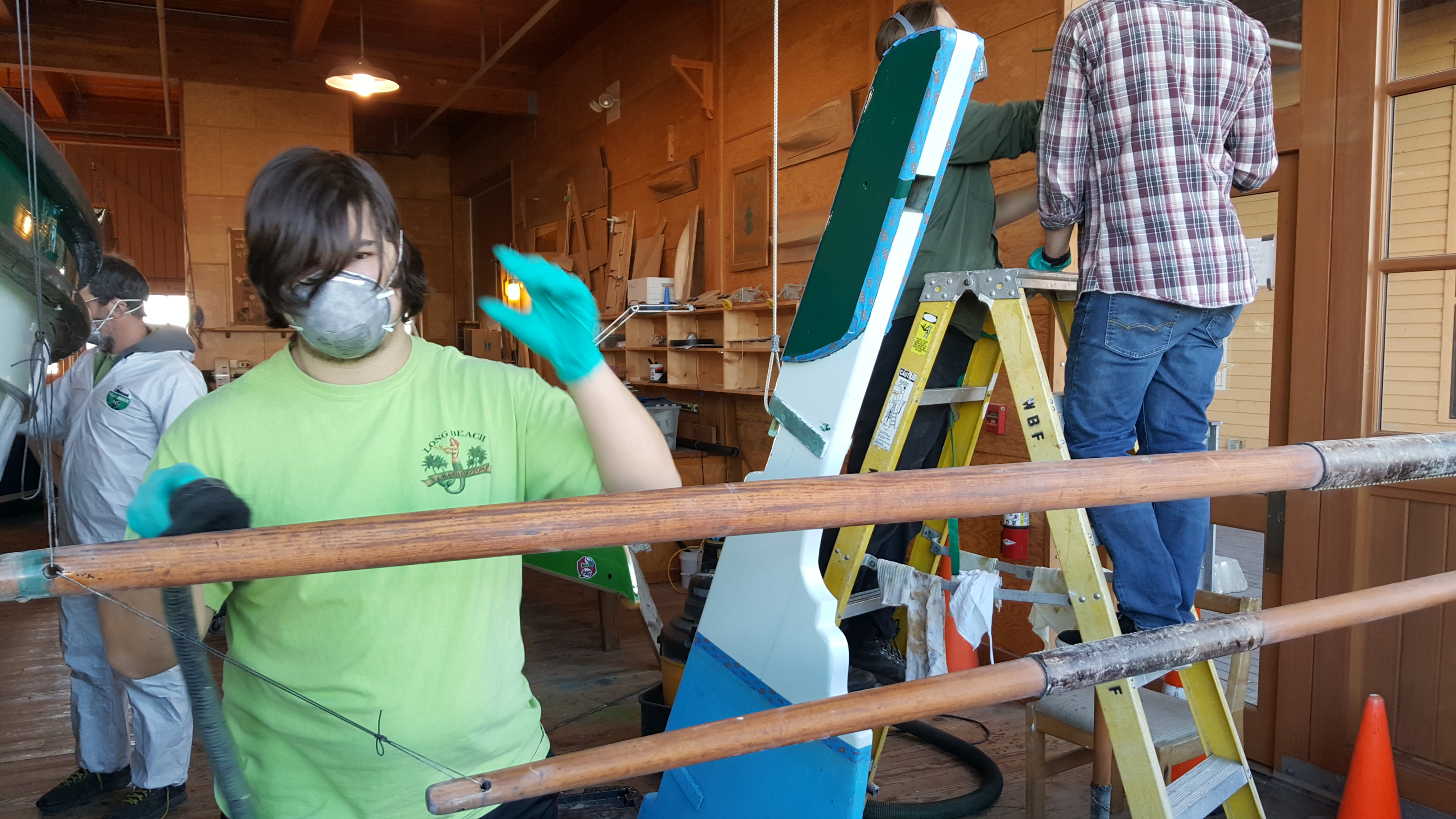 Oiling was the main focus today of over half the group. After vacuuming, students suited up in Tyvek Suits donated by Bob Frank at Admiral Ship Supply (THANKS Bob!) and started laying on oil. Townshend was thirsty and she soaked it right up. Oars and masts also got multiple coats today.