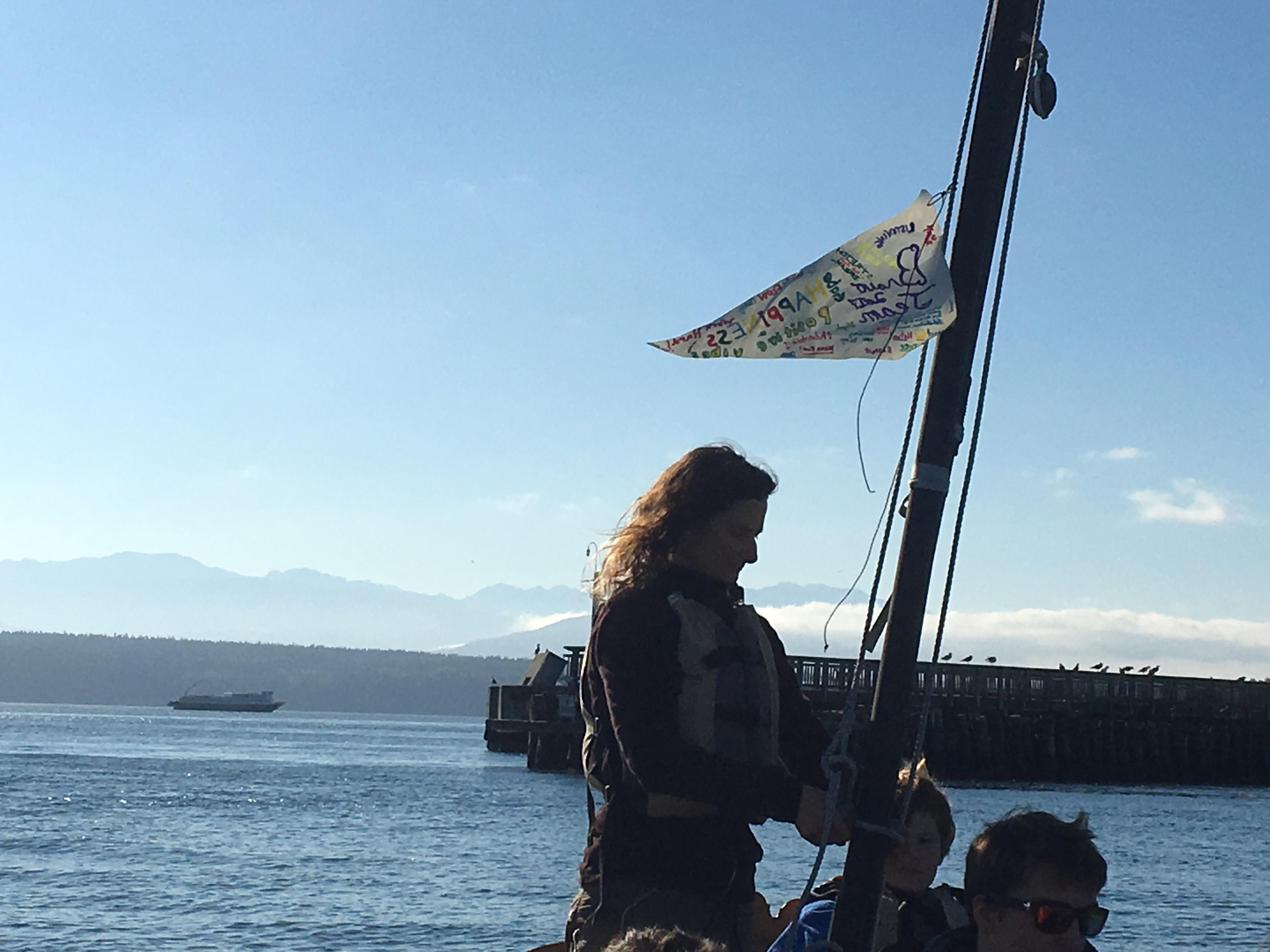 We headed out on the water aboard Townshend with Aiden taking the helm for the first time as coxswain, getting a chance to test out his voice of leadership and develop confidence. He had a trusty mate in Connor, who was the navigator for the day and was able to coach Aiden when he needed it. As our ship’s articles flapped in the wind, there was happy chatter while rowing upwind towards Fort Worden. We set the foresail and sailed downwind back to Point Hudson.