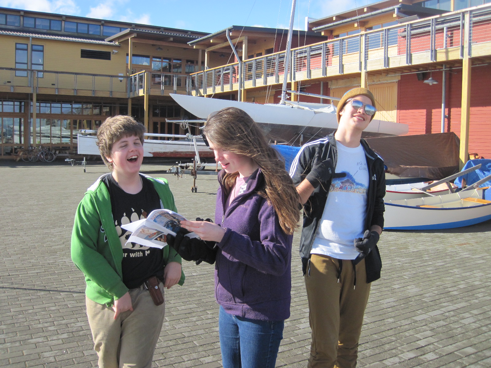 Finally, we reflected on our busy day with “High Tide, Low Tide.” Our High Tides were being out on the beach and getting splashed by waves, having our Moment of Silence outside in the sun and wind, playing games, project planning, and bending on sails. Our Low Tides (challenges) were forgetting how to tie the knots we needed on the boat, feeling a bit chilly, having our Moment of Silence end, and managing heavy gear safely while loading the boat.