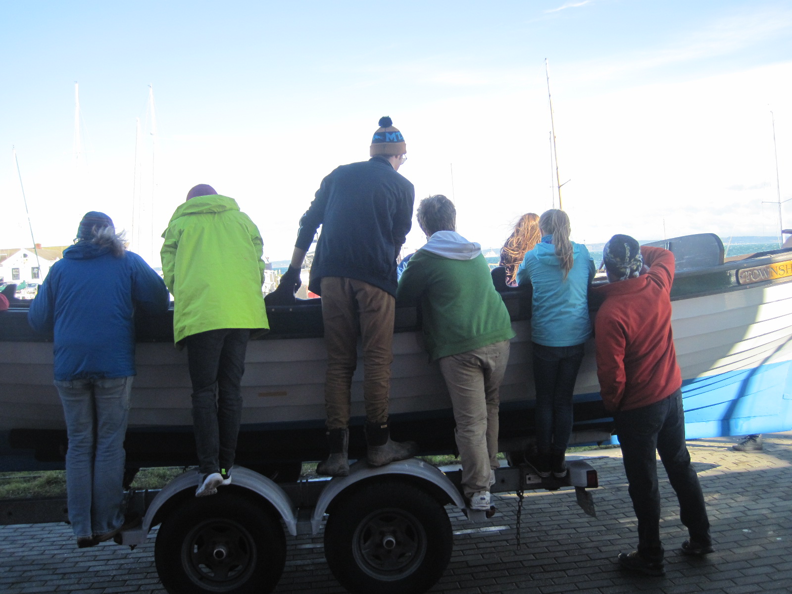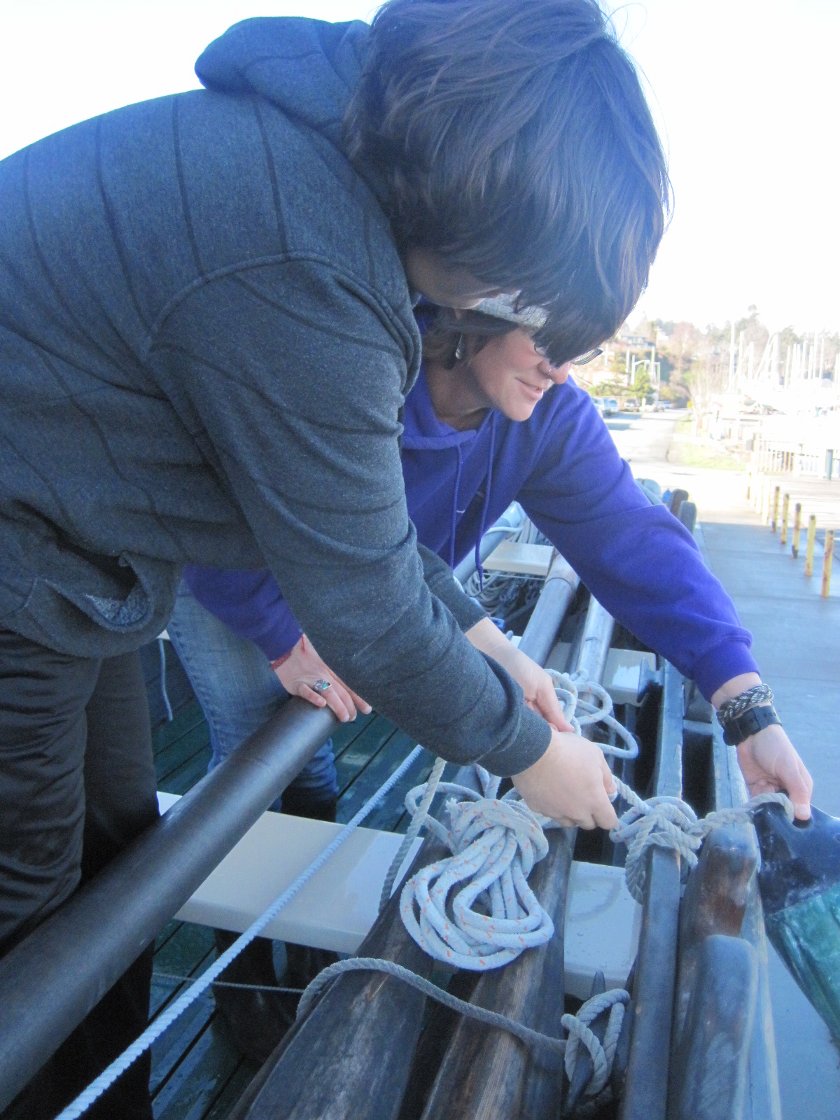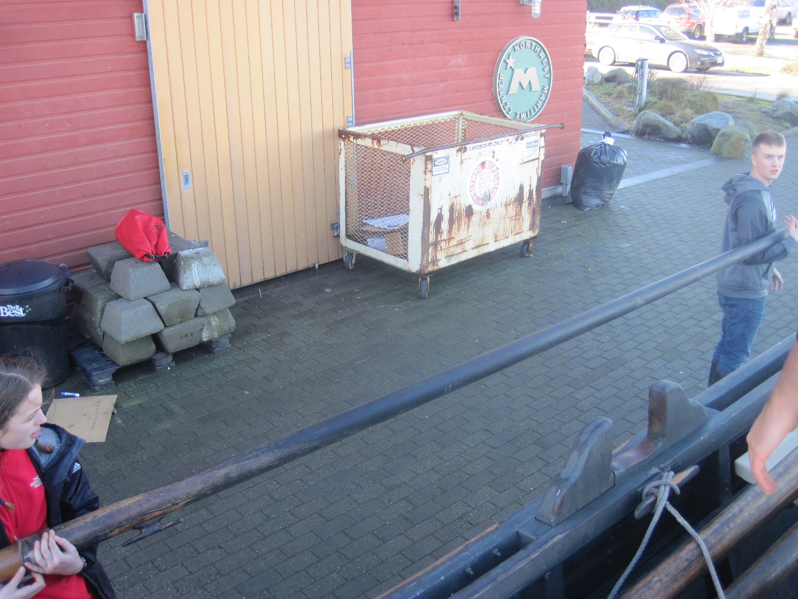 We took a moment to admire our work on Townshend. Even though we couldn’t launch her, we got her ready to launch by bringing much of her gear and parts aboard. Using clear communication, care, and eyes for safety we loaded oars, masts, anchors, and dock lines. A team in the Bosun’s locker bent the sails back on the newly varnished yards.